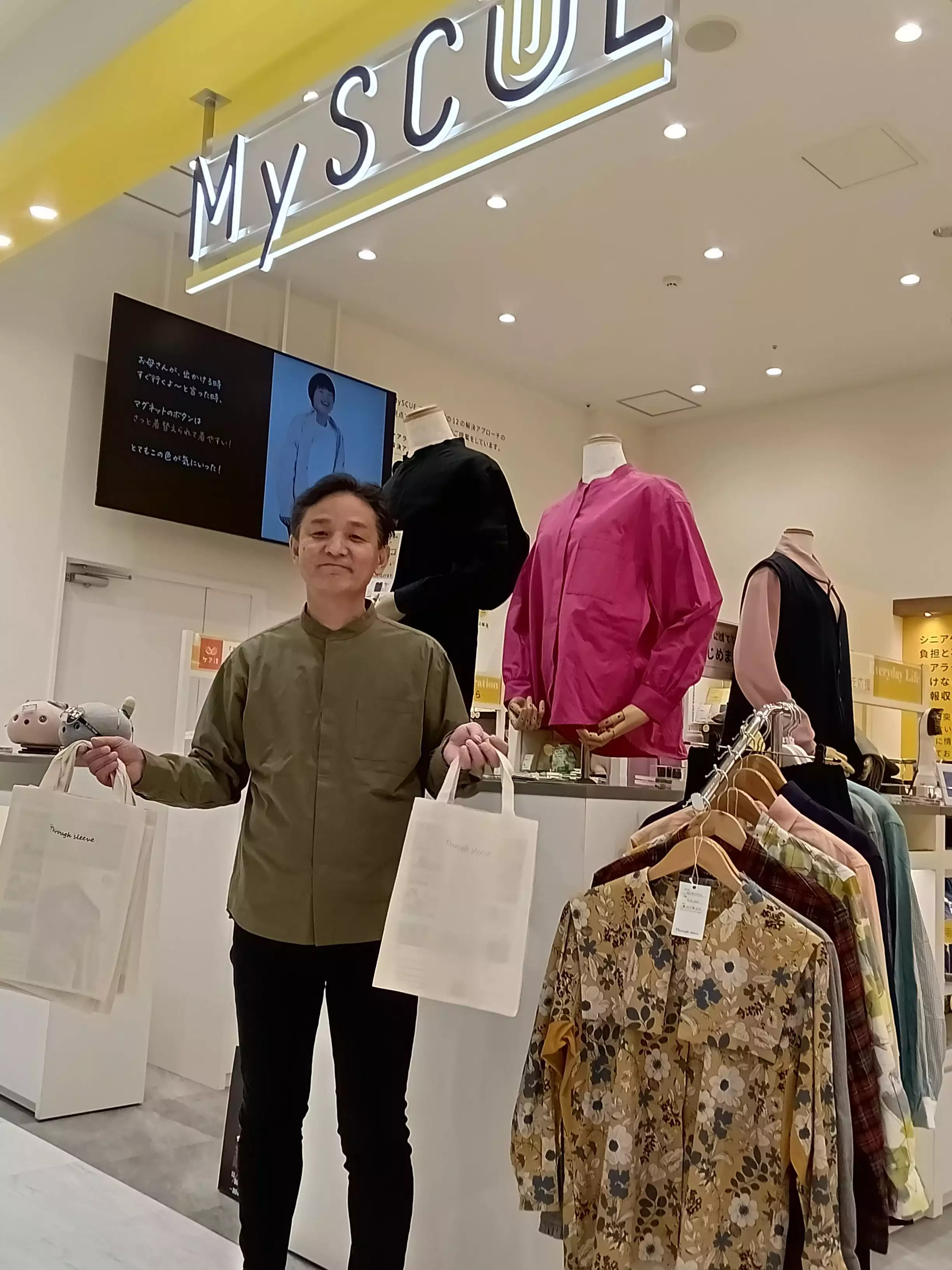 本日、MySCUE大日店には、株式会社KUTOの福田社長が来店してくださいました。店頭では、お客さまお一人おひとりに「片手でらく〜に着れるシャツ」こと スルースリーブ の特徴やこだわりを、直接お伝えいただいています。