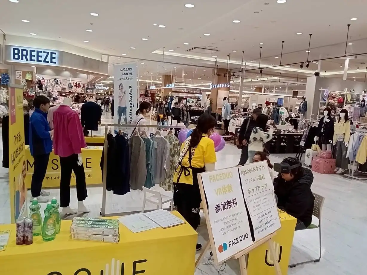 本日は イオンモール大日店MySCUE前のイベントスペースにて、シニア、ケアラーさんにおすすめのアパレル紹介、認知症を実際体験できるFACE DUOの体験会、そして株式会社ヘルスサイエンスのサポーターイベントを開催しました。