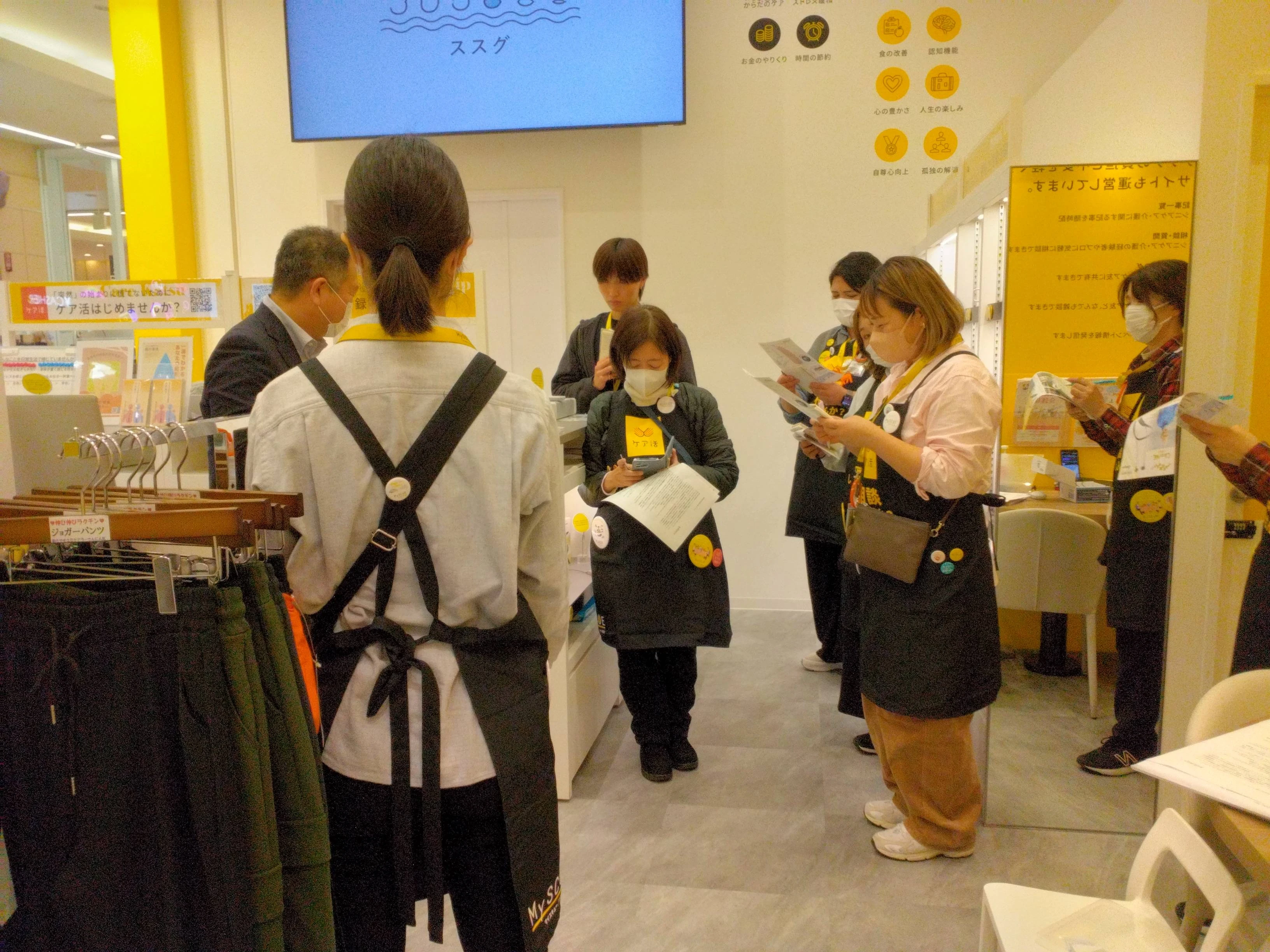 本日は、MySCUEイオンモール大日店とMySCUEイオンスタイル品川シーサイド店の合同で、新商品の勉強会および介護知識の勉強会を実施しています。