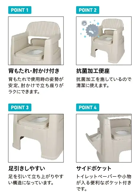 一般的なポータブルトイレは、箱型のものが多く、姿勢の安定や身体やサポートなどに気を配る必要があります。