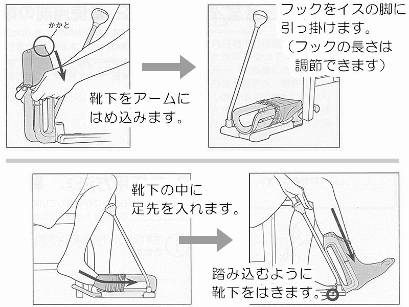 ・ イスの脚に引っ掛けて使用するので、靴下を引き上げる動作に力が入りやすく、楽に行えます。