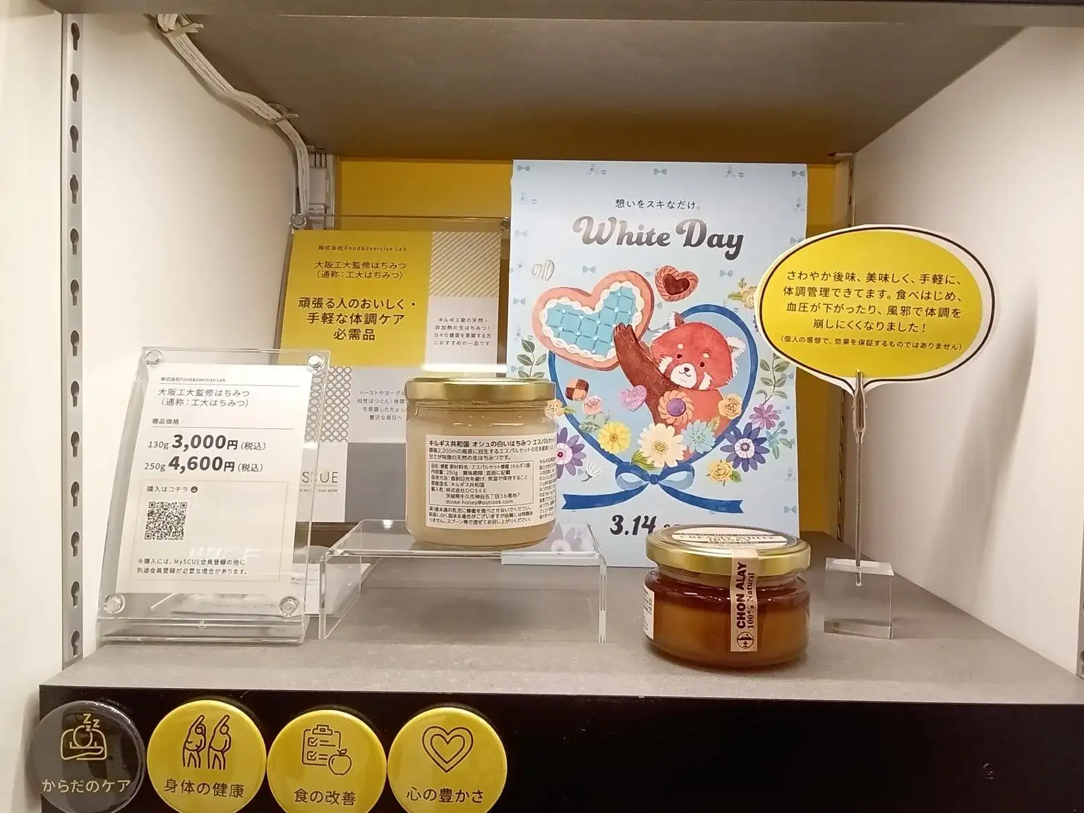 MySCUEイオンモール大日では大阪工大監修はちみつを取り扱っています。標高2,200mの高原に自生するエスパルセットの花を蜜源とした、白く美しい見た目と上品な甘さが特徴の天然の生はちみつです。