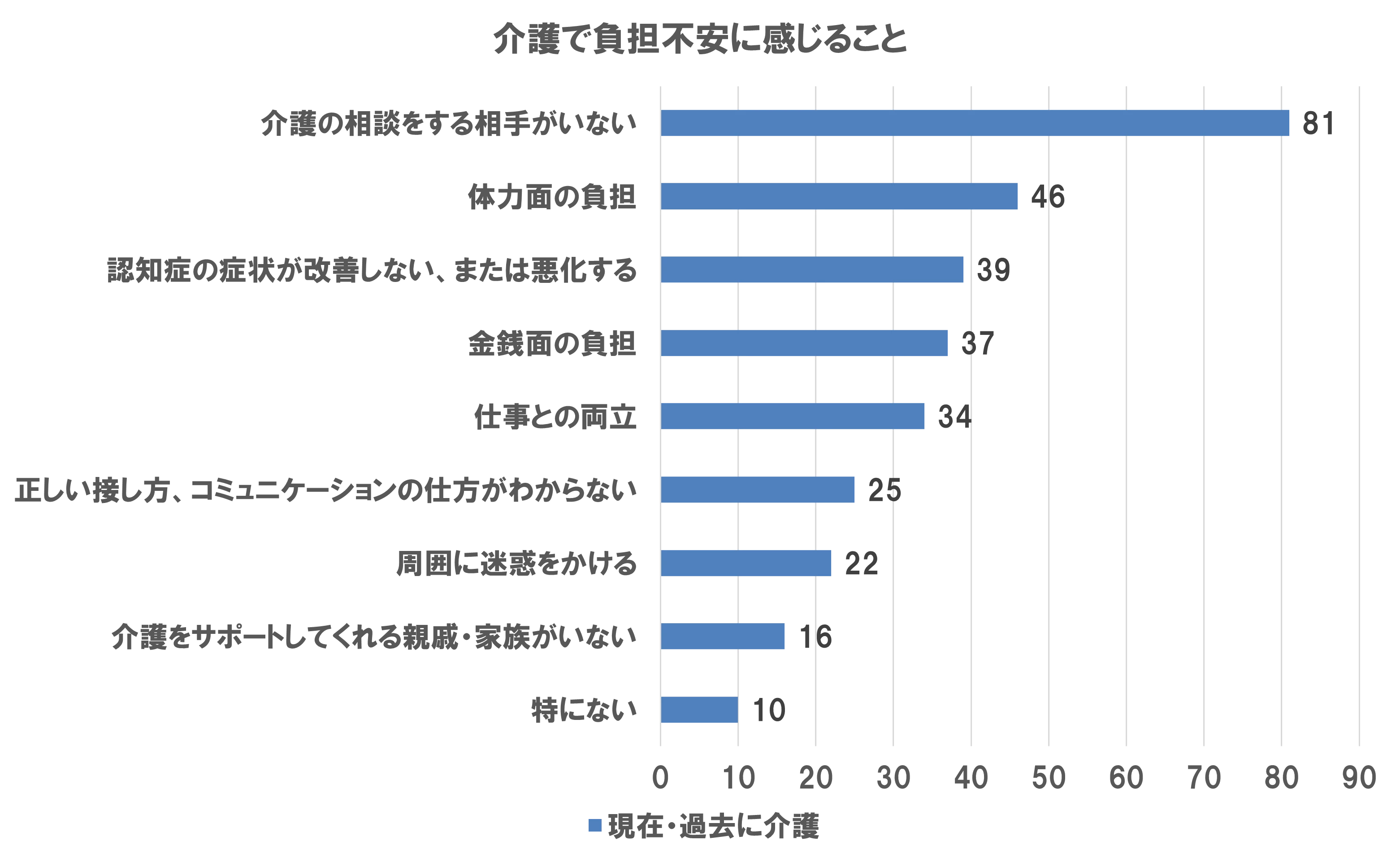 結果として、認知症の介護経験者は、相談相手がいないこと、症状が改善しないことに不安・負担に感じていることがわかりました。