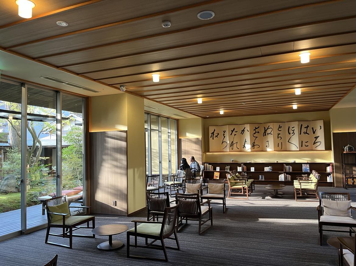 「いろはにほへと・・・」と書かれたトラベルライブラリーの屏風は北大路魯山人の書。白銀屋時代に訪れ、酔った勢いで書いたもので、最後の「ならむ」の3文字がないのが味。並びには魯山人ギャラリーがあり、器などを鑑賞できます。「器は料理の着物」という彼の料理哲学に習い、夕食では九谷焼と料理のマリアージュを提供。滞在するだけで加賀の文化を体感できるのです。
