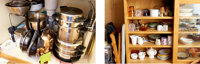 鍋やフライパン、包丁、カトラリー、食器などを整理するコツは、「いま使っているもの」と「使っていないもの」に分類することです。その際、使用頻度の低いアイテムやまったく使わなくなったアイテムは、できるだけ処分しましょう。増えすぎた保存容器やすぐに使わない紙皿なども同様に取捨選択を! ストック食材については、冷蔵庫の整理と同様、賞味期限・消費期限をチェックしてから、仕分けを行ってください。